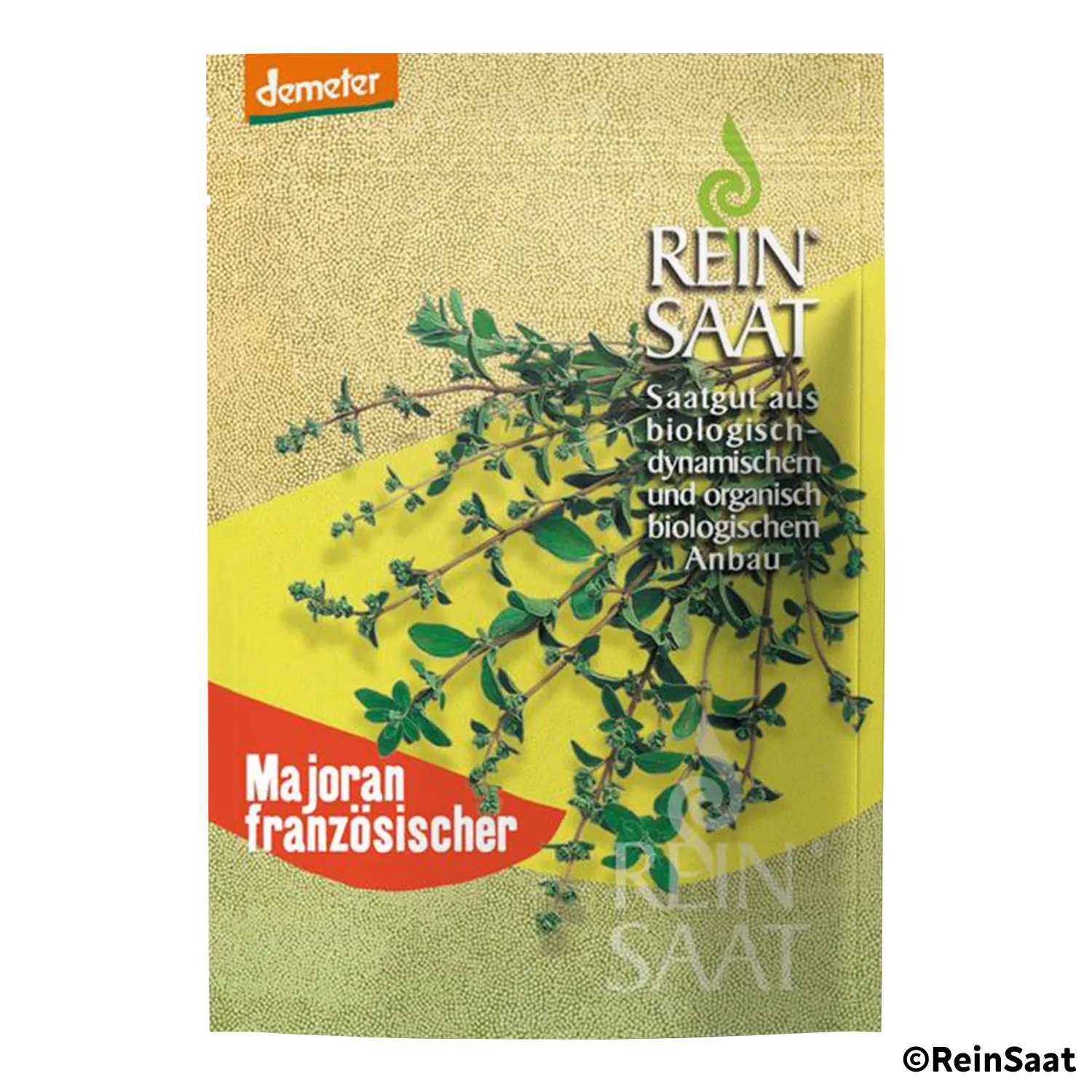 Der Majoran französischer Art (Origanum majorana) ist eine einjährige Gewürz-, Heil- und Bienenpflanze mit blumig-würzigem Aroma. Er wächst 30–50 cm hoch und bereichert die Küche sowohl frisch als auch getrocknet – ideal für Kartoffel- und Fleischgerichte, Wurstwaren oder Gewürzmischungen.