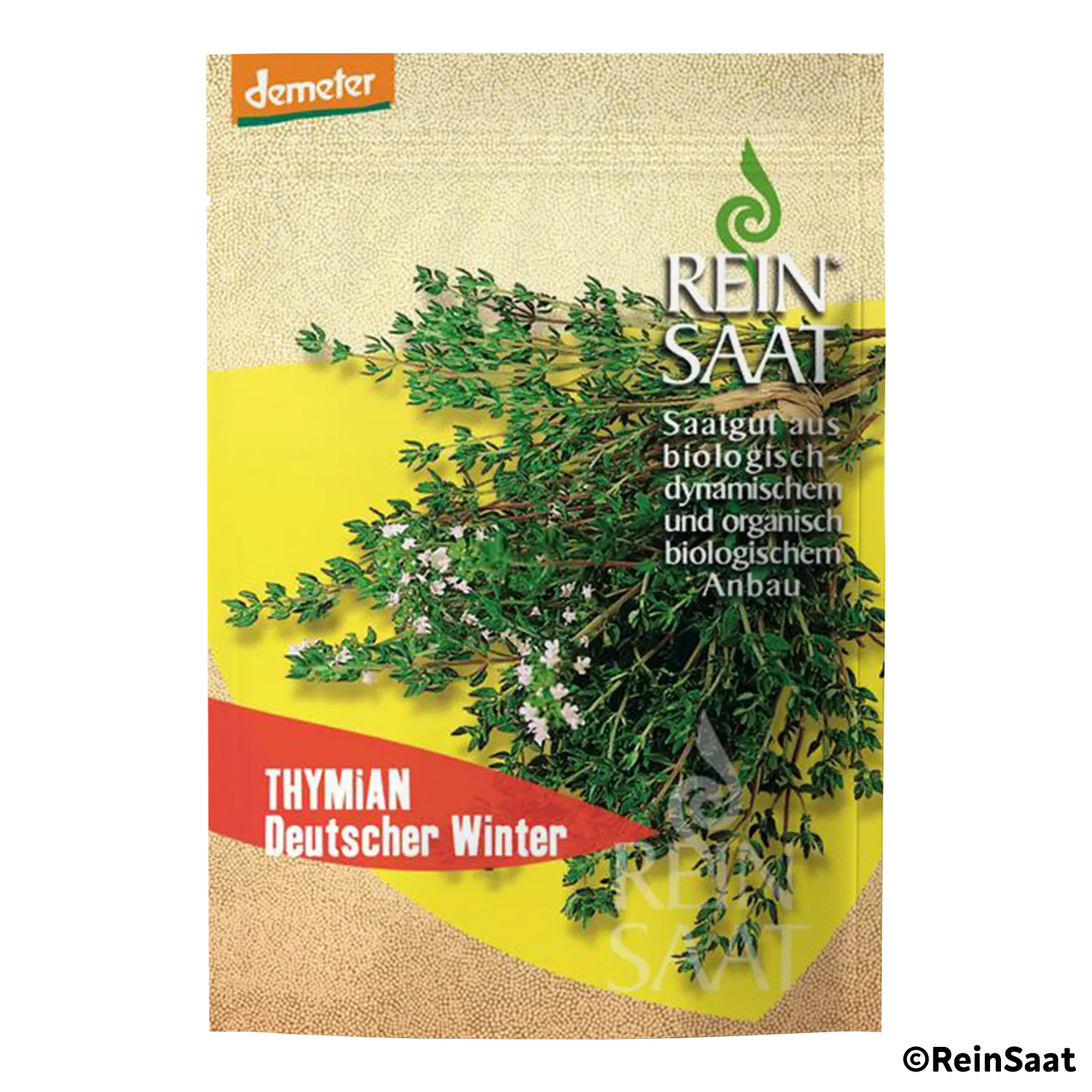 Der Thymian Deutscher Winter (Thymus vulgaris) ist eine mehrjährige Heil- und Gewürzpflanze, die als 30–40 cm hoher, immergrüner Halbstrauch zuverlässig durch die kalte Jahreszeit kommt. Sein herb-aromatischer Geschmack ist ein Muss für mediterrane Gerichte und deftige Speisen.