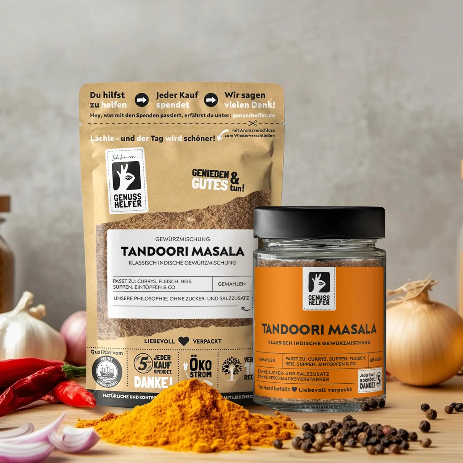 Die Tandoori Masala Gewürzmischung bestellen Sie bei uns im Onlineshop ausschließlich aus natürlichen Zutaten. Es wurden keinerlei Geschmacksverstärker, Aromen, Farb- oder Zusatzstoffe für den Geschmack oder zur Konservierung beigemischt.