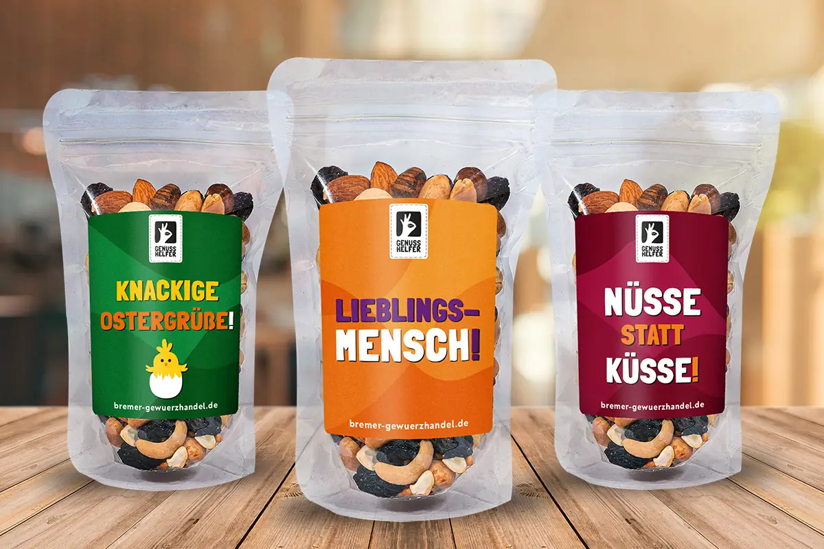 Verschenken Sie unsere knackig-süße GeNUSSmischung an Ihre Mitarbeiter oder Kollegen - also an diejenigen, die Ihnen am Herzen liegen und denen Sie einfach so zwischendurch oder als kleines Dankeschön eine Aufmerksamkeit zukommen lassen möchten. Wählen Sie gerne aus unseren vorhandenen Genussbotschaften oder lassen Sie Ihre individuelle Botschaft auf unsere Nussfruchtmischungen drucken! So originell können Firmengeschenke sein.