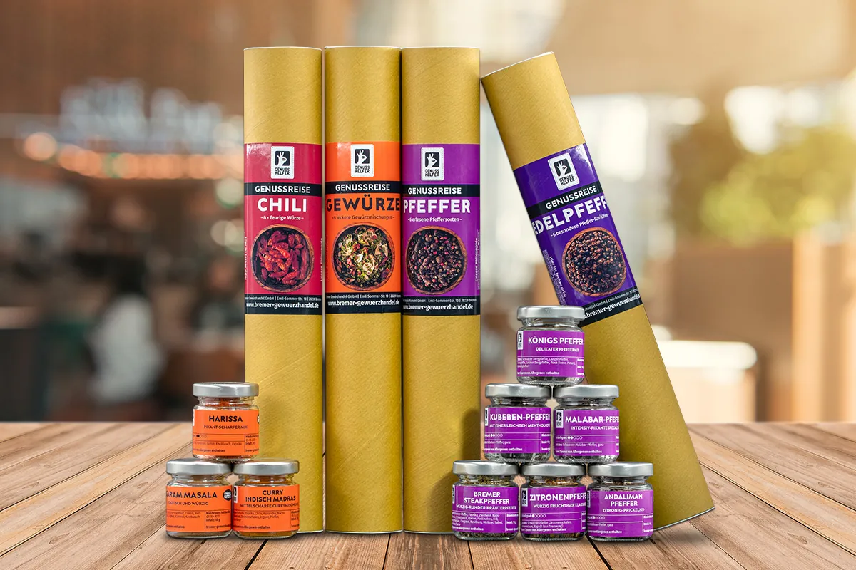 Nehmen Sie Ihre Kunden, Mitarbeiter oder Lieferanten mit auf eine ganz besondere, kulinarische Reise und wählen Sie aus unseren 8 verschiedenen Genussreisen Ihre ganz persönlichen Firmengeschenke aus! Ganz gleich, ob Ihre Wahl auf die Welt der Salze oder des Pfeffers fällt oder Sie einen Ausflug in die Welt des Currys unternehmen - mit unseren Genussreisen beweisen Sie guten Geschmack! Die Umverpackung ist ein echter Hingucker! Alle sechs enthaltenen Gläser haben einen praktischen Schraubverschluss.