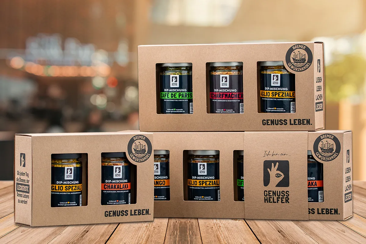 Unsere Dip-Spezialitäten werden in praktische Aufbewahrungsgläser mit Schraubverschluss gefüllt. Da kommen Dip-Enthusiasten garantiert auf ihre Kosten. Ganz gleich, ob als kleines Präsent für Kollegen oder ausgefallene Aufmerksamkeit für Ihre Kunden: Unsere 2er, 3er oder 4er Dip-Sets sind originelle Firmenpräsente oder Mitarbeiter Geschenke zu jedem Anlass. Alle Dip-Spezialitäten im Set kaufen Sie zu 100% als NATURtalent. Wir verzichten bewusst auf Füllstoffe und Rieselhilfen sowie auf die Zugabe von Geschmacksverstärkern und anderen, künstlichen Zusatz- und Konservierungsstoffen.