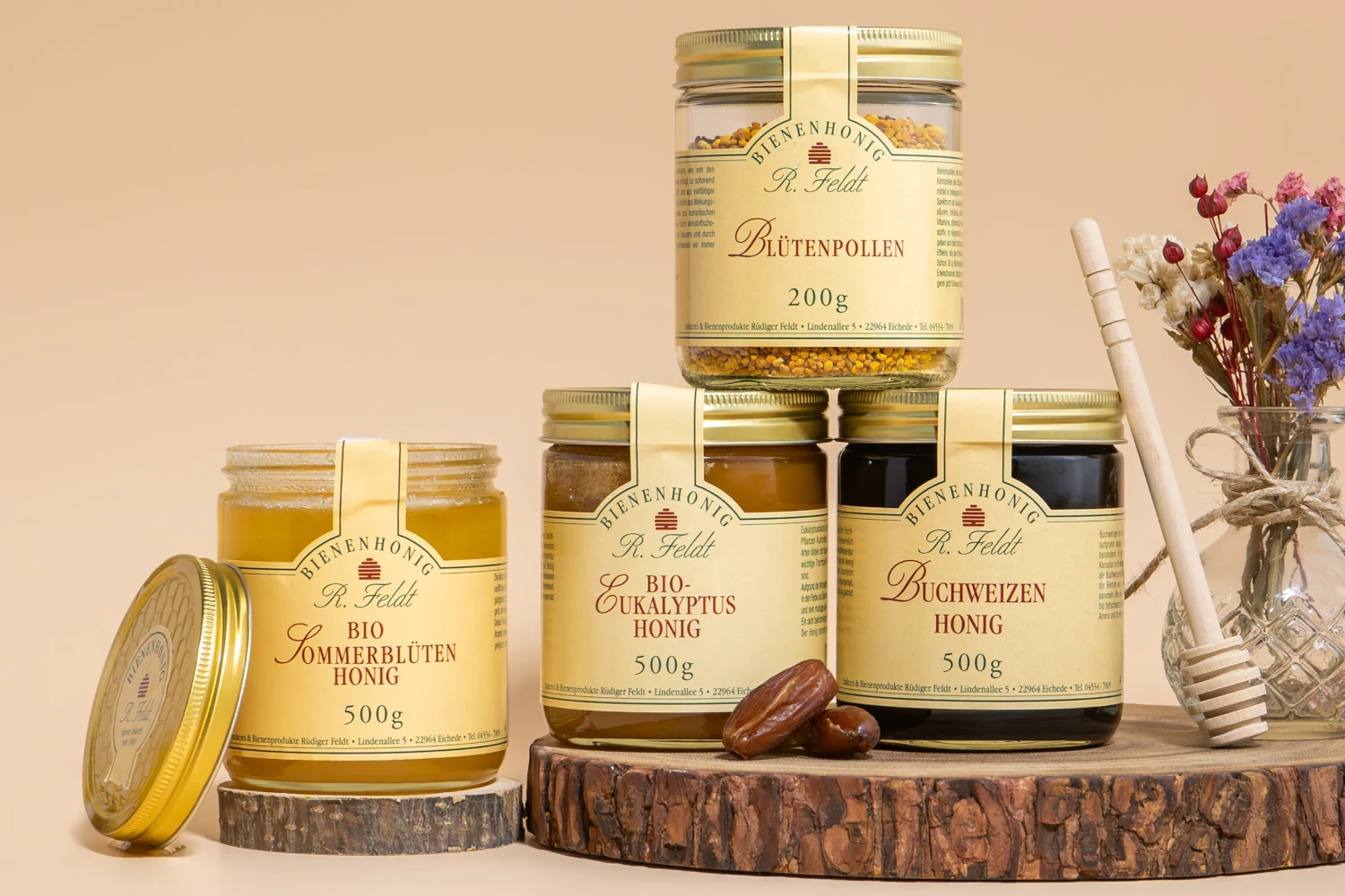 Die Rüdiger Feldt Imkerei hat ihren Sitz in Schleswig-Holstein und bietet seit 1965 feinste Honige aus aller Welt an. Die Marke hat es sich von Anfang an zum Ziel gesetzt, neben dem eigenen Honig auch andere, qualitativ sehr hochwertige Honigsorten anzubieten. Alle Honige der Marke Feldt sind immer Premium-Honige. Das bedeutet, sie sind nicht vermischt mit anderen Honigen. Sie werden schonend abgefüllt und werden auch nicht künstlich im Wassergehalt gesenkt. Selbstverständlich werden alle Honige regelmäßig in Laboren kontrolliert. Wer einen Honig der Imkerei Rüdiger Feldt erwirbt, der bekommt einen ausgesprochen hochwertigen Honig, oftmals sogar in BIO-Qualität.